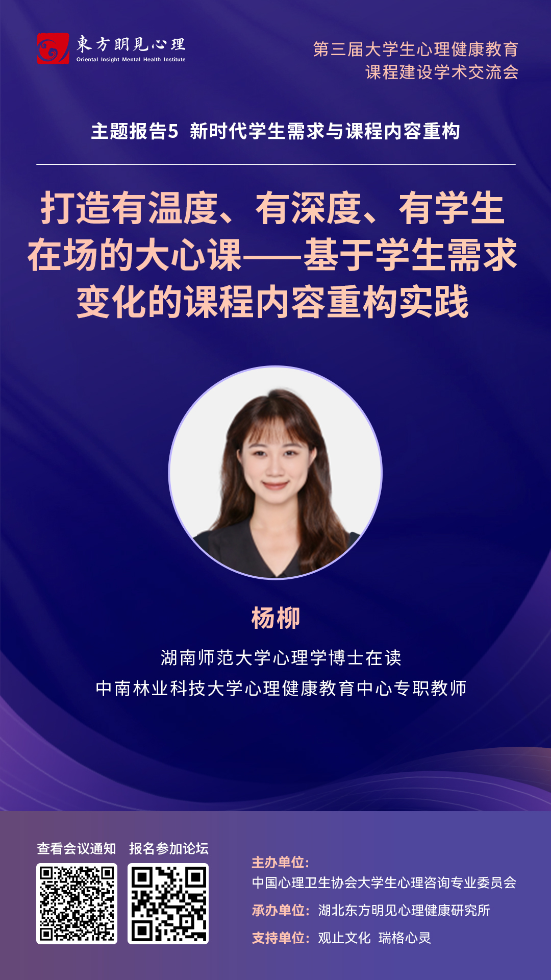 8月24日,第三届“大学生心理健康教育课程建设论坛”在线举行。我校心理健康教育中心教师杨柳受邀在“主题报告5:新时代学生需求与课程内容重构”单元作专题报告,题为《打造有温度、有深度、有学生在场的大心课》。