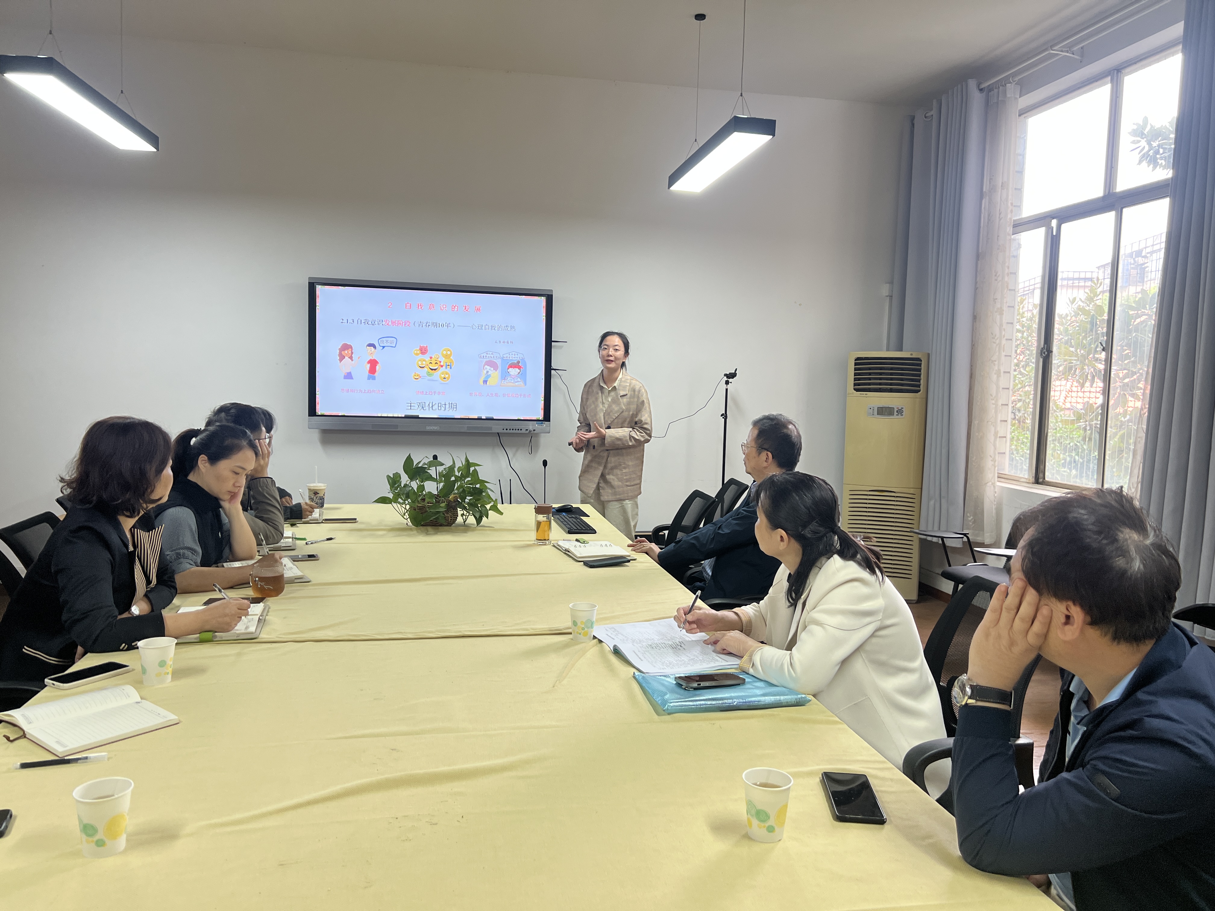 会议由心理中心主任袁红梅老师主持,心理健康专任教师蔺璐璐和杨柳就本学期《心理健康教育课程》第三次主题《自我意识》章节进行了试讲与说课展示。