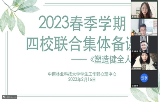 为推动“湖南省高校心理健康示范中心对口协作项目”建设,促进四校交流,探讨如何进一步提升教学水平,2023年2月16日上午9点,我校学生工作部心理中心举办本学期第一次四校联合集体备课活动,主题为《塑造健康人格》。本次活动采用线上的形式,我校与湖南女子学院、湖南涉外经济学院、湖南外国语职业学院专兼职心理教师参与了此次线上研讨会。