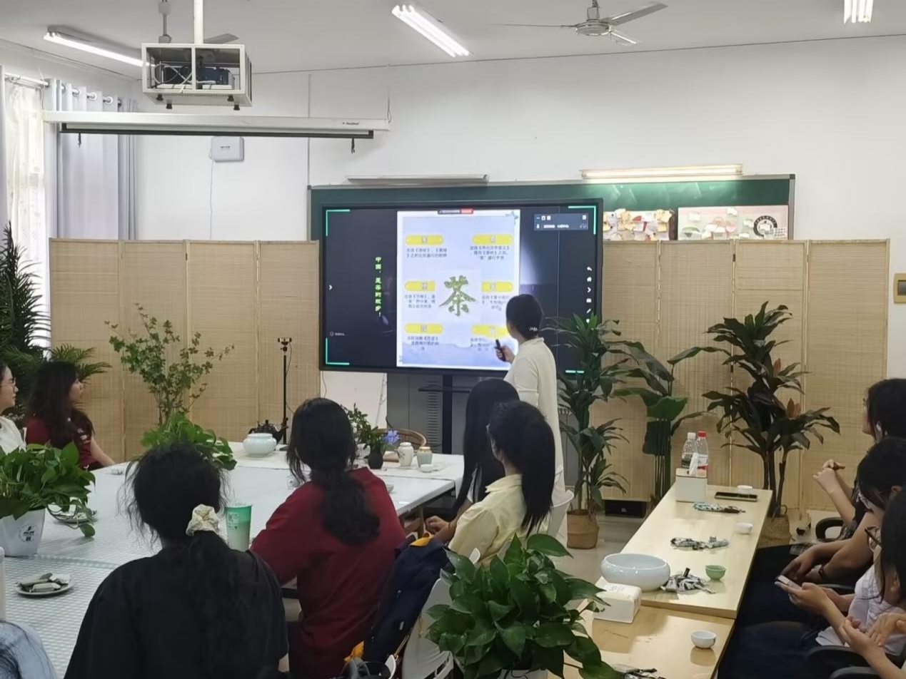 活动现场以节气文化为脉络,青瓷茶席搭配绿植盆景,垂落的《七碗茶歌》诗词纱幔营造出雅致氛围。唐立英老师以卢仝茶诗为引,解析"茶味人生"的哲学意蕴,并逐步演示传统茶艺流程。在正念茶饮环节中,师生跟随指导进行"三息观茶法":注水时聆听水流清响,观茶时深呼吸三次,品茗时专注口腔温度变化,在古典琴音中体验"此刻即永恒"的心流状态。